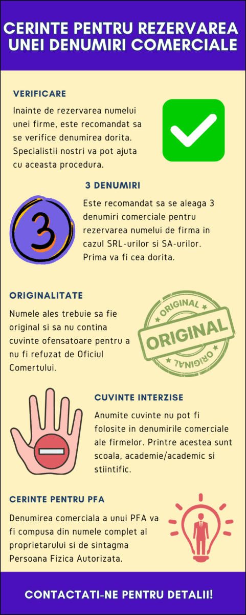 Rezervarea se face pe o perioada limitata, urmand ca dupa expirarea acestui timp sa se poata face o noua rezervare. Cei interesati de infiintare firma in Bucuresti si in tara trebuie sa stie ca pentru unele tipuri de nume, precum cele care contin cuvinte precum universitate, scoala, institut, national, etc, este nevoie de acord special.